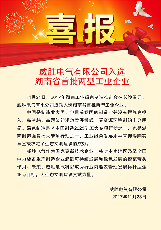 11月21日,2017年湖南工業(yè)綠色制造推進(jìn)會(huì)在長(zhǎng)沙召開,威勝電氣有限公司成功入選湖南省首批兩型工業(yè)企業(yè)。