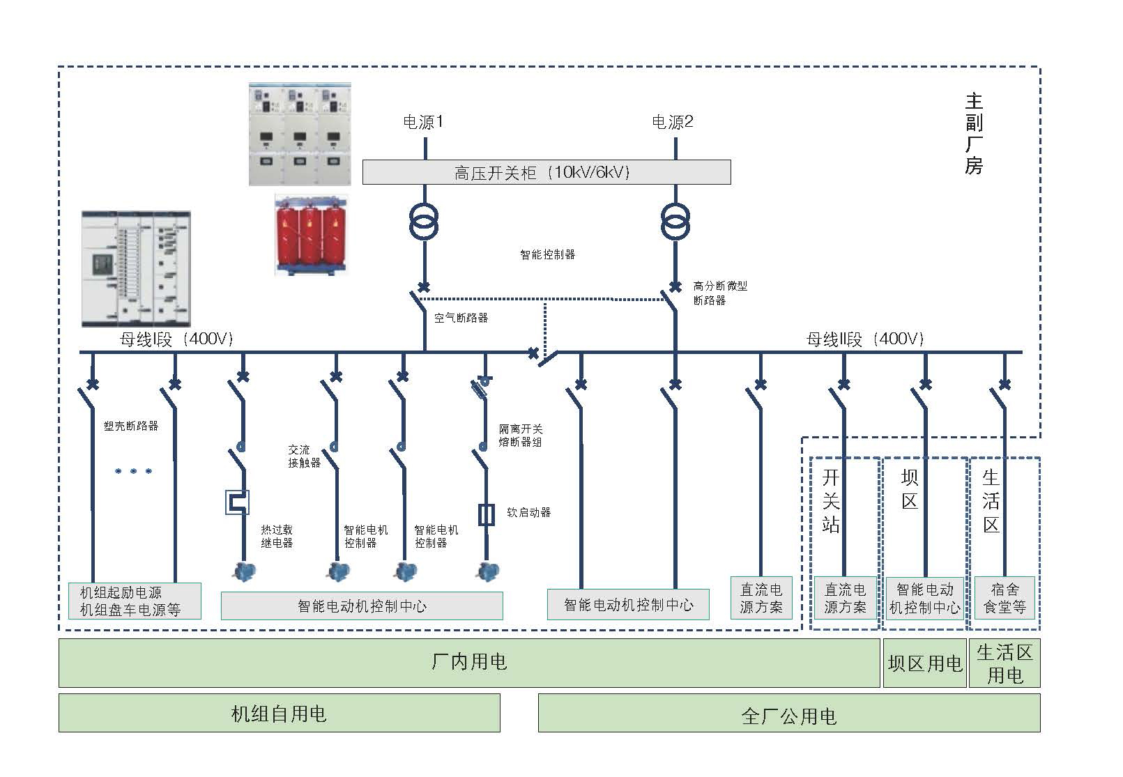 中型水電站裝機容量一般為 25MW 小于水電站容量≤ 250MW,廠用電電源采用雙層輻射式供電,兩級電壓分別為 10kV / 6kV、400V 供電,機組自用電和全廠公用電采用混合式供電方式。威勝電氣水力發(fā)電智能配電解決方案主要設(shè)備包含發(fā)電機側(cè)6.3KV開關(guān)柜,站用10KV開關(guān)柜、0.4KV開關(guān)柜及其配套相關(guān)配電設(shè)備。