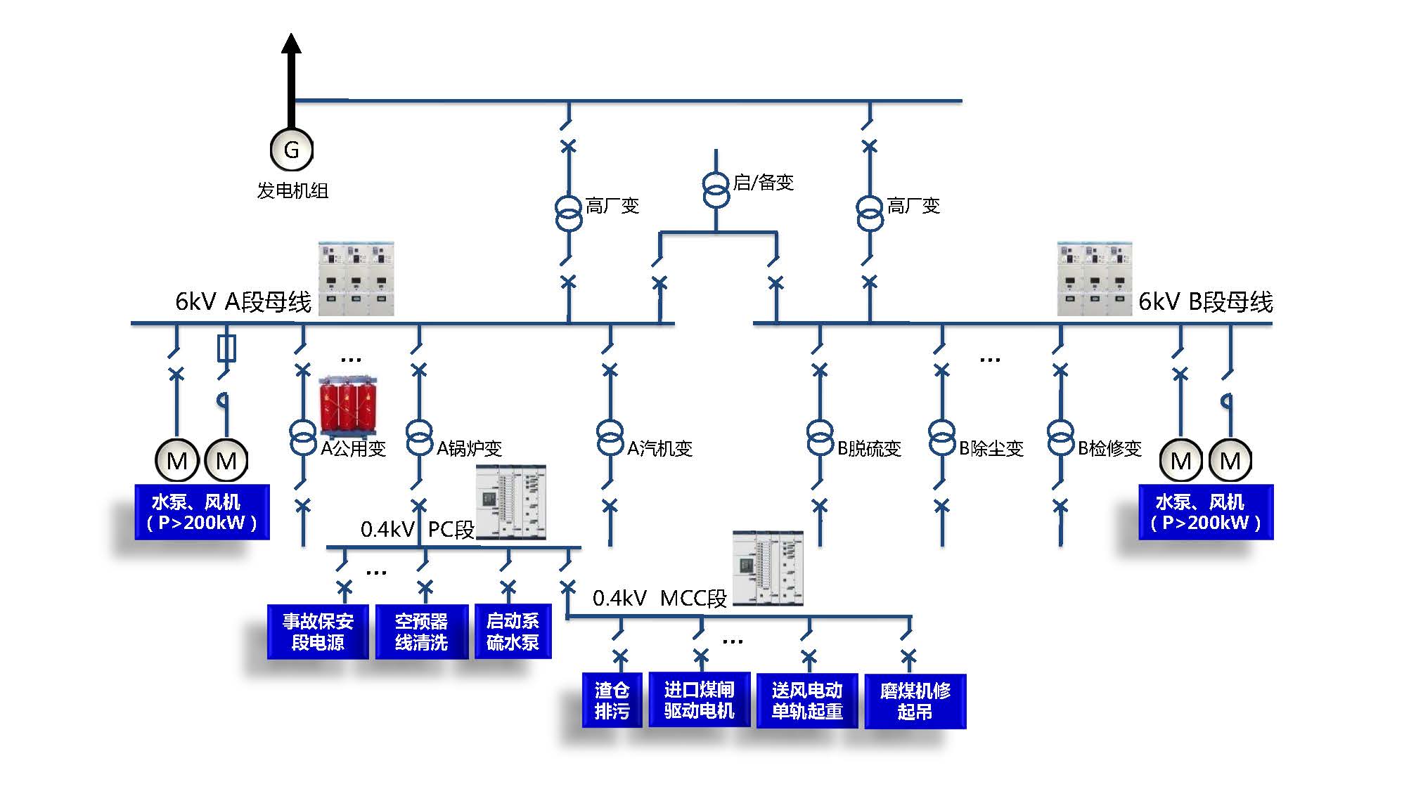 中壓系統(tǒng)通過中低壓廠用變壓器,供電給廠用電低壓動力設(shè)備和照明、檢修等。低壓廠用電系統(tǒng)通常采用動力中心PC、電動機控制中心MCC供電方式。對于PC和MCC供電,威勝電氣提供通過全型式試驗的西門子授權(quán)SIVACON 8PT低壓配電柜、施耐德授權(quán)Blokset低壓配電柜、MNS低壓配電柜,滿足低壓配電線路保護和電動機保護控制要求。