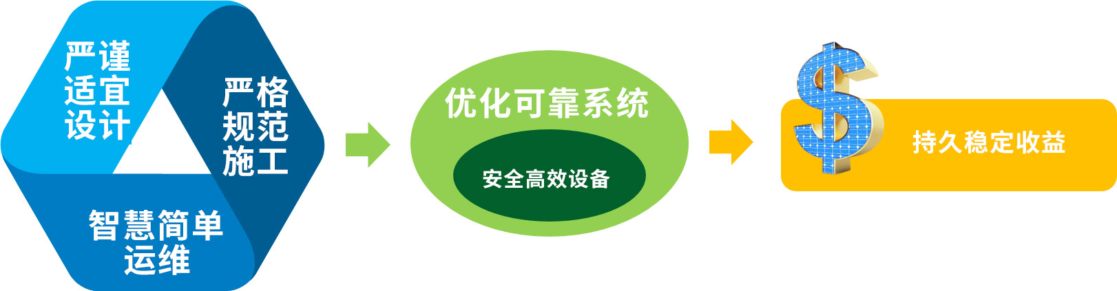 我們通過嚴(yán)謹(jǐn)適宜的設(shè)計、嚴(yán)格規(guī)范的施工和智慧簡單的運維,建設(shè)并運營一個由安全高效的設(shè)備組成的優(yōu)化可靠的新能源發(fā)電系統(tǒng),希望業(yè)主能收獲持久穩(wěn)定的收益。