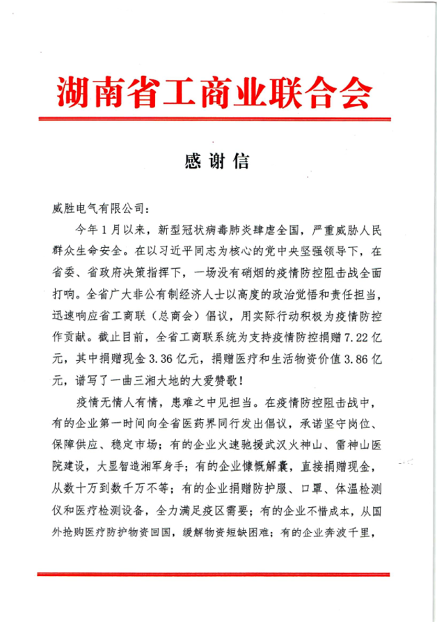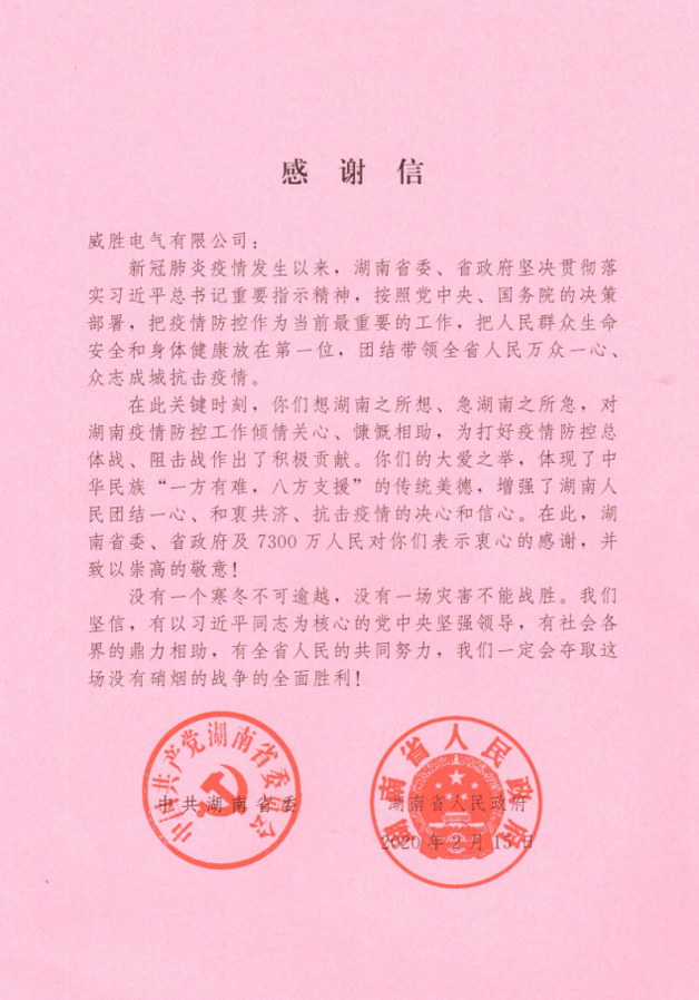 近期,威勝電氣先后收到來自中共湖南省委、湖南省人民政府及湖南省工商業(yè)聯(lián)合會的感謝信,信中表達了對威勝電氣在疫情期間馳援一線善舉的肯定與贊揚。