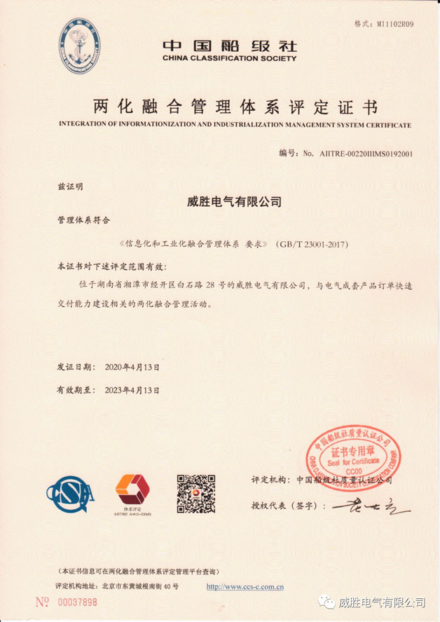 經(jīng)過(guò)中國(guó)船級(jí)社專家來(lái)司評(píng)估現(xiàn)場(chǎng)審核工作,最終威勝電氣順利通過(guò)兩化融合體系評(píng)估認(rèn)證。并于2020年4月13日收到國(guó)家工信部簽發(fā)的兩化融合管理體系評(píng)定證書(shū)。
