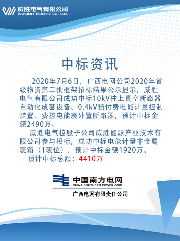 2020年7月6日,廣西電網(wǎng)公司2020年省級(jí)物資第二批框架招標(biāo)結(jié)果公示顯示,威勝電氣有限公司成功中標(biāo)10kV柱上真空斷路器自動(dòng)化成套設(shè)備、0.4kV預(yù)付費(fèi)電能計(jì)量控制裝置、費(fèi)控電能表外置斷路器,預(yù)計(jì)中標(biāo)金額2490萬(wàn)。