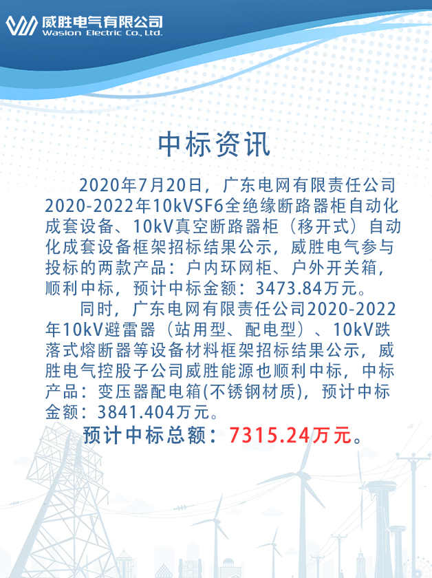 2020年7月20日,廣東電網(wǎng)有限責(zé)任公司2020-2022年10kVSF6全絕緣斷路器柜自動(dòng)化成套設(shè)備、10kV真空斷路器柜(移開(kāi)式)自動(dòng)化成套設(shè)備框架招標(biāo)結(jié)果公示,威勝電氣參與投標(biāo)的兩款產(chǎn)品:戶內(nèi)環(huán)網(wǎng)柜、戶外開(kāi)關(guān)箱順利中標(biāo),預(yù)計(jì)中標(biāo)金額:3473.84萬(wàn)元。同時(shí),廣東電網(wǎng)有限責(zé)任公司20202022年10kV避雷器(站用型、配電型)、10kV跌落式熔斷器等設(shè)備材料框架招標(biāo)結(jié)果公示,威勝電氣控股子公司惟遠(yuǎn)能源也順利中標(biāo),中標(biāo)產(chǎn)品:變壓器配電箱(不銹鋼材質(zhì)),預(yù)計(jì)中標(biāo)金額:3841.404萬(wàn)元。預(yù)計(jì)中標(biāo)總額:7315.24萬(wàn)元