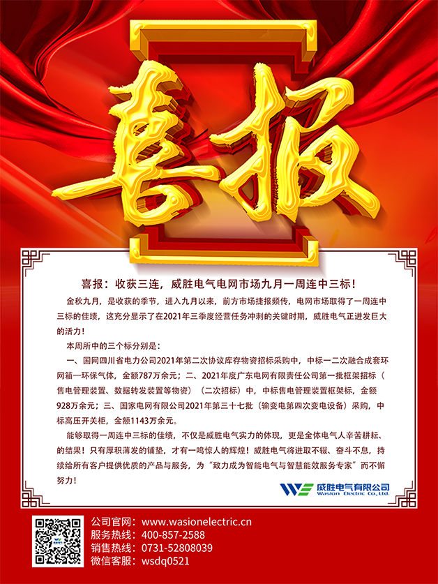 金秋九月,是收獲的季節(jié),進(jìn)入九月以來,前方市場捷報(bào)頻傳,電網(wǎng)市場取得了一周連中三標(biāo)的佳績,這充分顯示了在2021年三季度經(jīng)營任務(wù)沖刺的關(guān)鍵時(shí)期,威勝電氣正迸發(fā)巨大的活力!