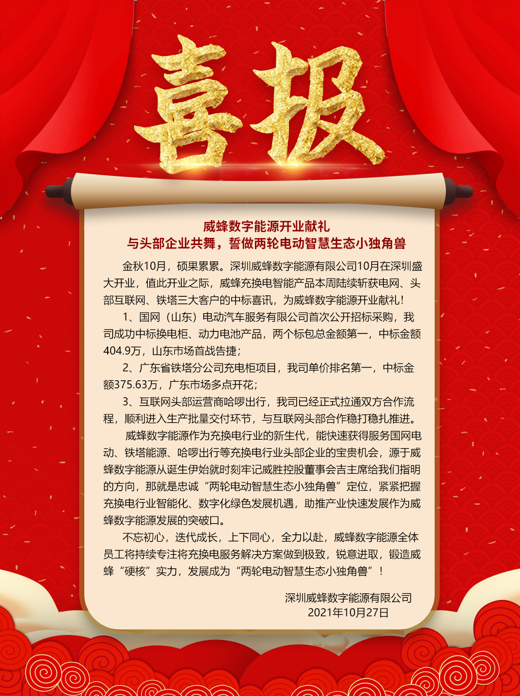 金秋10月,碩果累累。深圳威蜂數(shù)字能源有限公司10月在深圳盛大開業(yè),值此開業(yè)之際,威蜂充換電智能產(chǎn)品本周陸續(xù)斬獲電網(wǎng)、頭部互聯(lián)網(wǎng)、鐵塔三大客戶的中標(biāo)喜訊,為威蜂數(shù)字能源開業(yè)獻禮!