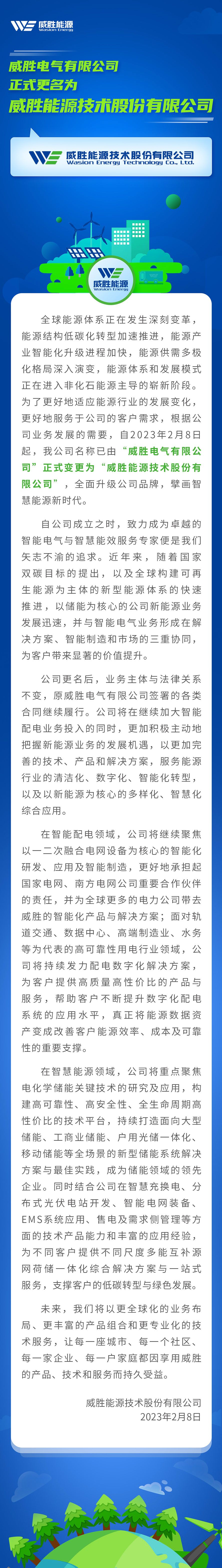全球能源體系正在發(fā)生深刻變革,能源結(jié)構(gòu)低碳化轉(zhuǎn)型加速推進(jìn),能源產(chǎn)業(yè)智能化升級(jí)進(jìn)程加快,能源供需多極化格局深入演變,能源體系和發(fā)展模式正在進(jìn)入非化石能源主導(dǎo)的嶄新階段。為了更好地適應(yīng)能源行業(yè)的發(fā)展變化,更好地服務(wù)于公司的客戶需求,根據(jù)公司業(yè)務(wù)發(fā)展的需要,自2023年2月8日起,我公司名稱已由“威勝電氣有限公司”正式變更為“惟遠(yuǎn)能源技術(shù)股份有限公司”,全面升級(jí)公司品牌,擘畫(huà)智慧能源新時(shí)代。